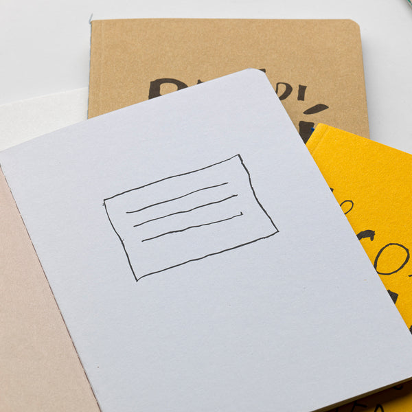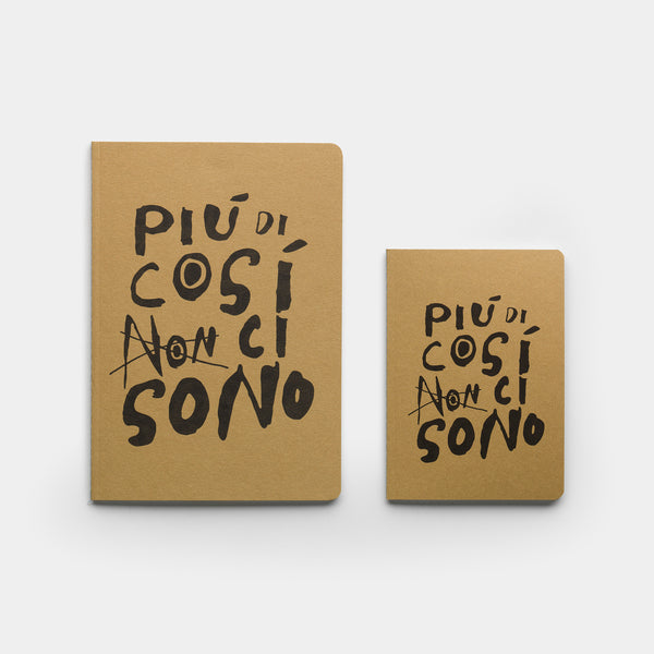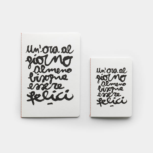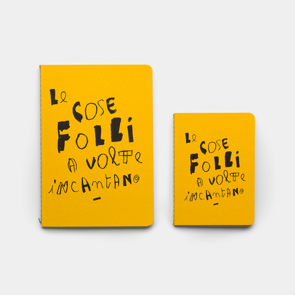 Quaderni con copertine stampate in nero su pregiate carte Fedrigoni Materica (limestone, quartz, terra gialla, kraft), interni in carta usomano da 100g, 56 pagine con stampa a puntini. Rilegatura punto Singer con filo colorato a vista.
